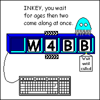 INPUT, INPUT LINE, GET and GET$ all wait for a key to be pressed before the program continues. We will now put two commands under the microscope that allow us to specify an amount of time we can wait before BASIC gives up and continues. The functions INKEY and INKEY$ can both take a number which specifies the amount of time to wait in centiseconds (just like our friend the WAIT command). If a key is pressed in this time, the function returns its value just as GET and GET$. INKEY returns the ASCII value and INKEY$ returns a single character string. The codes for the extended keys (function, cursor etc.) are just the same as GET and GET$, which is a good thing, really. If no key was pressed in the time, –1 or an empty string is returned.