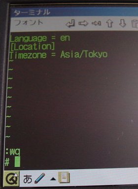 - type "i" (insert mode) - change the line to "Language = en" (press "cancel" key for command mode, "x" delete under cursor). - press the "Cancel" key - save the file (type ":wq" ) - Press the "Q" icon at the lower left corner - select "Reboot" and select "Yes" (more simple commands in vi note "ESC" = "Cancel") |