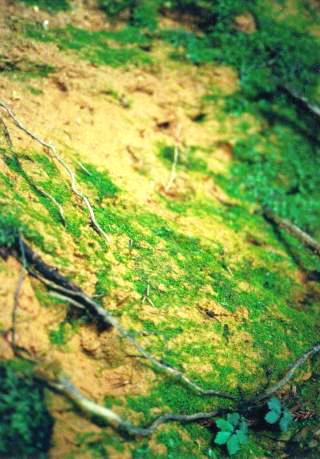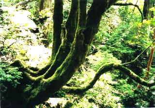 ここで初めて山小屋に泊まっていて朝小屋から下りて来たカップルとすれちがいます。あいさつをかわし、ウィルソン株の中に入ってお参りします。なかは完全に空洞で、天井はなく、見上げると空が見えます。寮の部屋など問題にならない位の広さです。ウィルソン株の内側にも、こけが付きかけています。一帯は湿地帯になっていて、と言うより一面あちこちに清烈な清水がとどまることなく流れています。水はとても綺麗です。