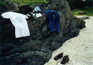 意を決して、荷物を下ろし、ジーパンとTシャツを脱ぎ捨てます。まあ、水着に見えないこともないトランクスなのでぜんぜんおっけーでしょー。水に入ると、