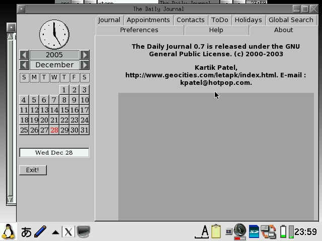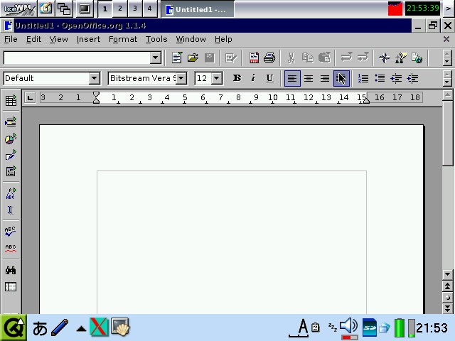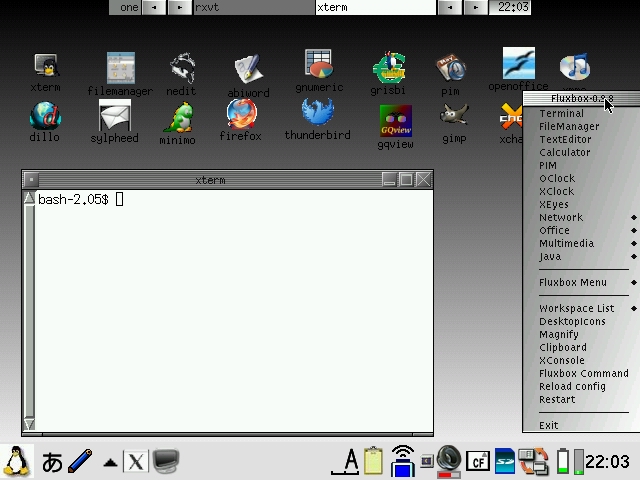 The default window manager for X/Qt jumbo is now fluxbox which is an enhanced version of blackbox. The taskbar is at the top of the screen, so it is not hidden behind the Qt taskbar anymore. You can use X control to change X to fullscreen if you don't want to see the Qt taskbar. X control can be activated by pressing the menu button which allows you to switch to fullscreen X and/or shutdown X. Pressing Fn key + m will also shutdown X/Qt. Holding down the Fn key while tapping with the stylus will get you the fluxbox control menu.
